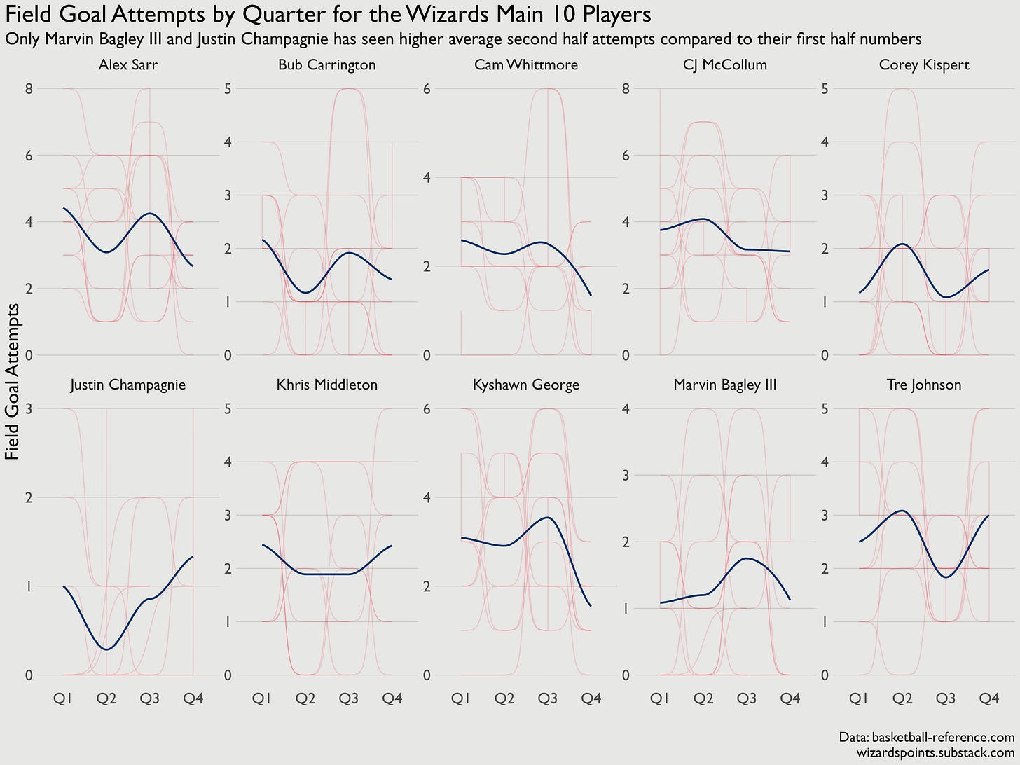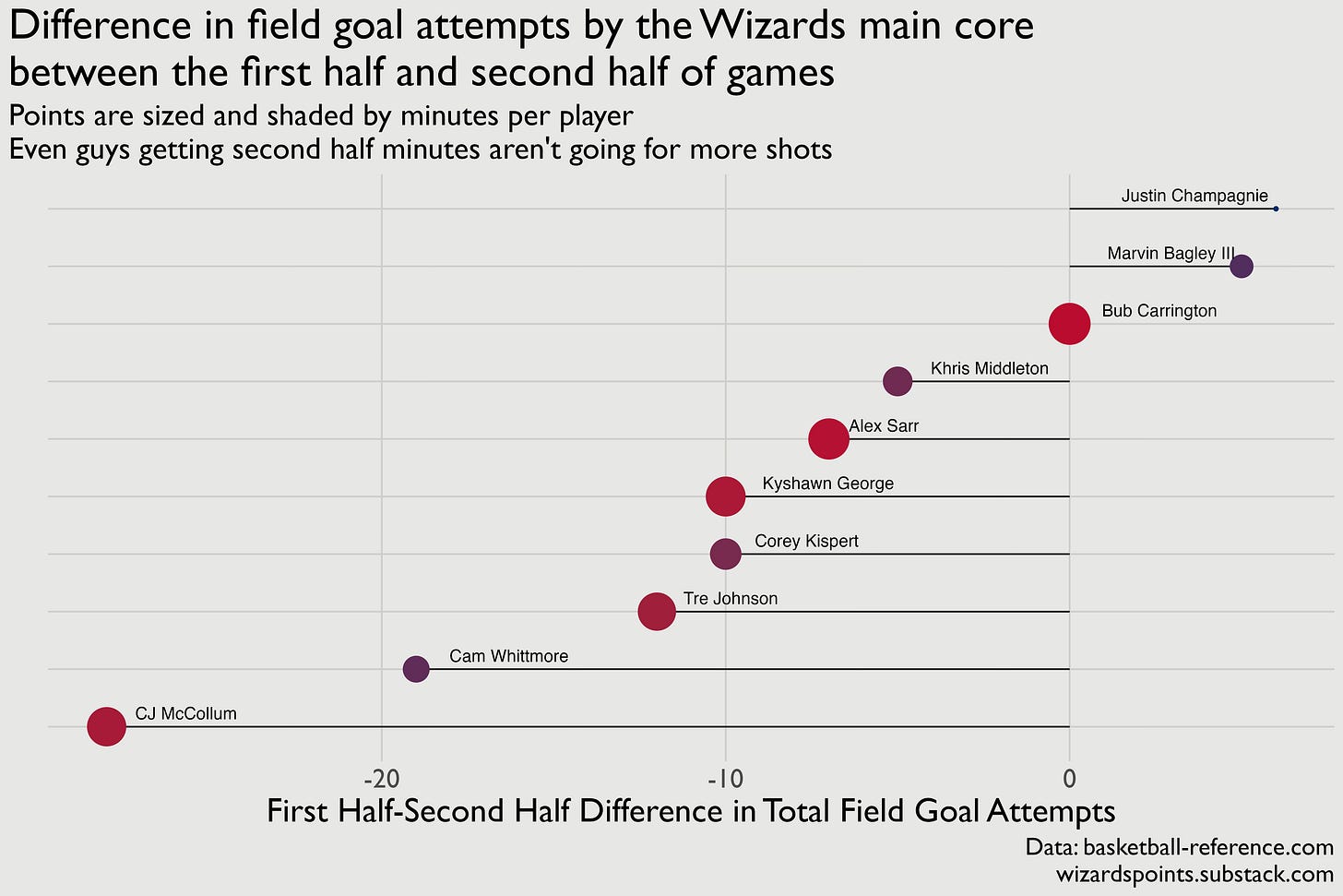 It is true that attempts aren’t everything. Kyshawn George, Khris Middleton, and Bub actually have seen their average field goal percentage (i.e., how many shots they make as a percentage of how many they take) increase in the second half of games so far, but that’s partly because they’re taking fewer shots. And yeah, there’s plenty of reason to be a little choosier with shot selection at times, but I would say the 1-11 Wizards are not in those times.