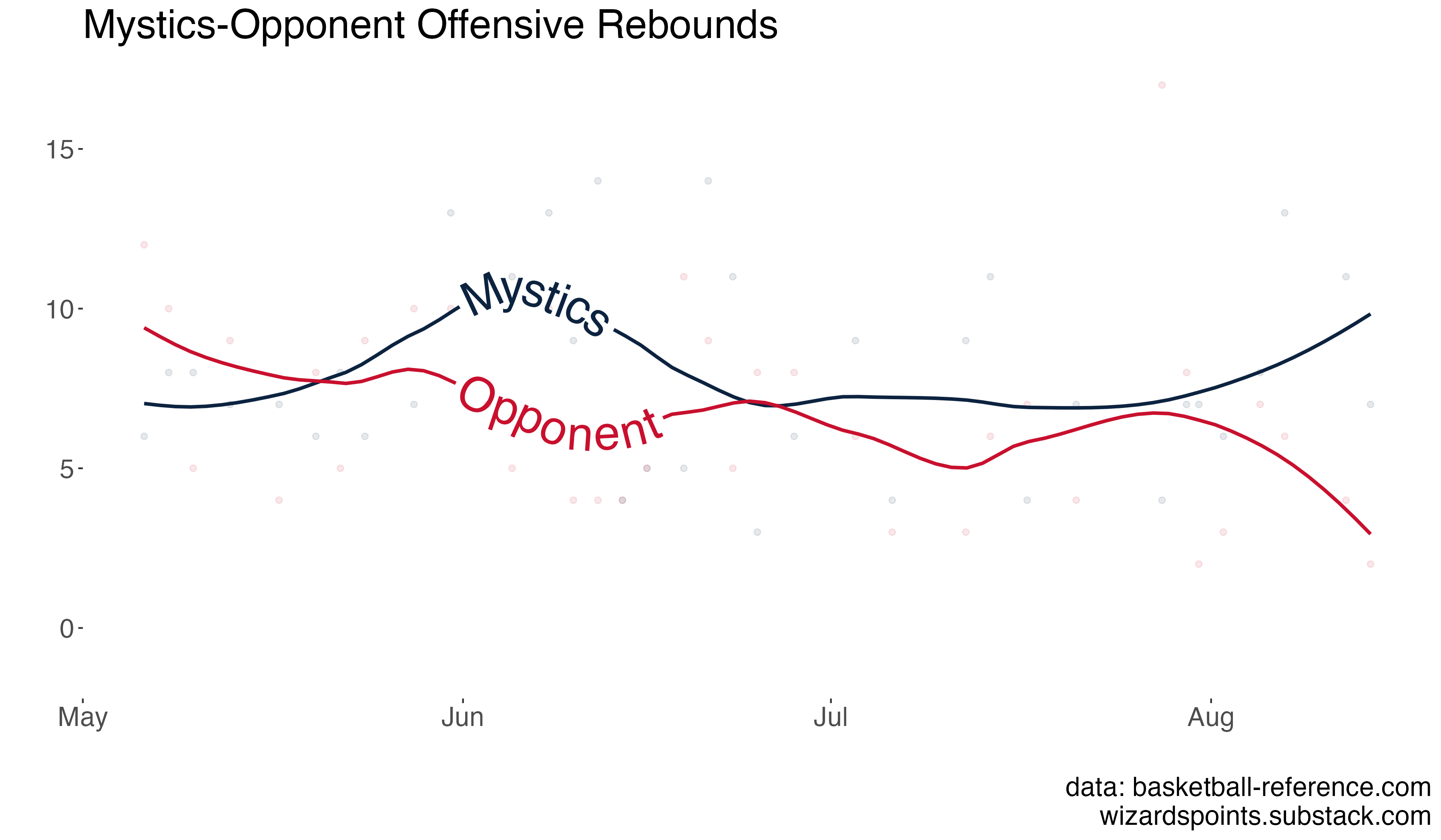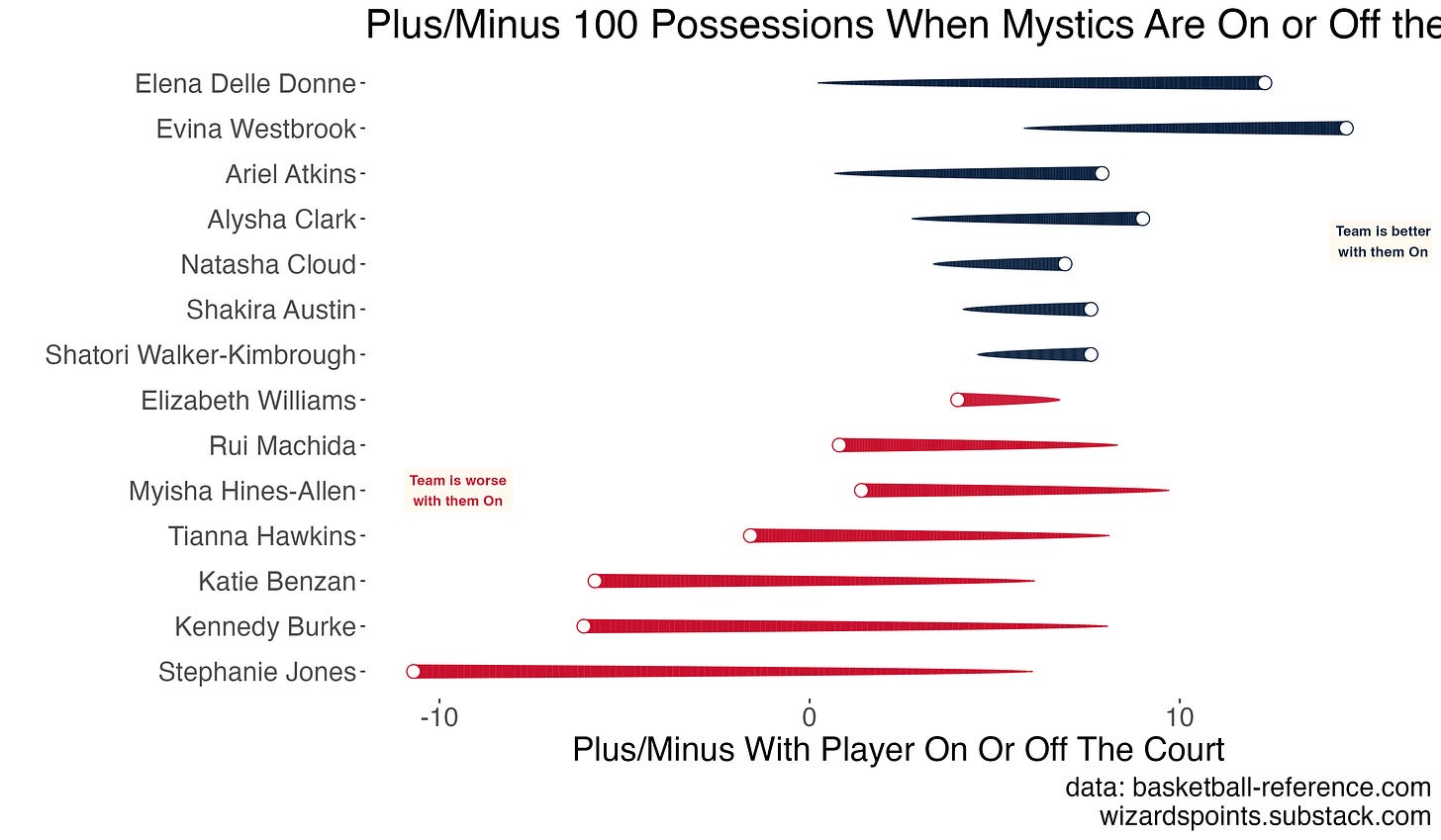 I’ve noted before that on-off stats are not anyone’s favorite and plus/minus also has its issues. As expected, all of the starters are a net positive for the Mystics, but even some of the players who are stronger on defense, like rookie Shakira Austin, are helping the team win on offense.