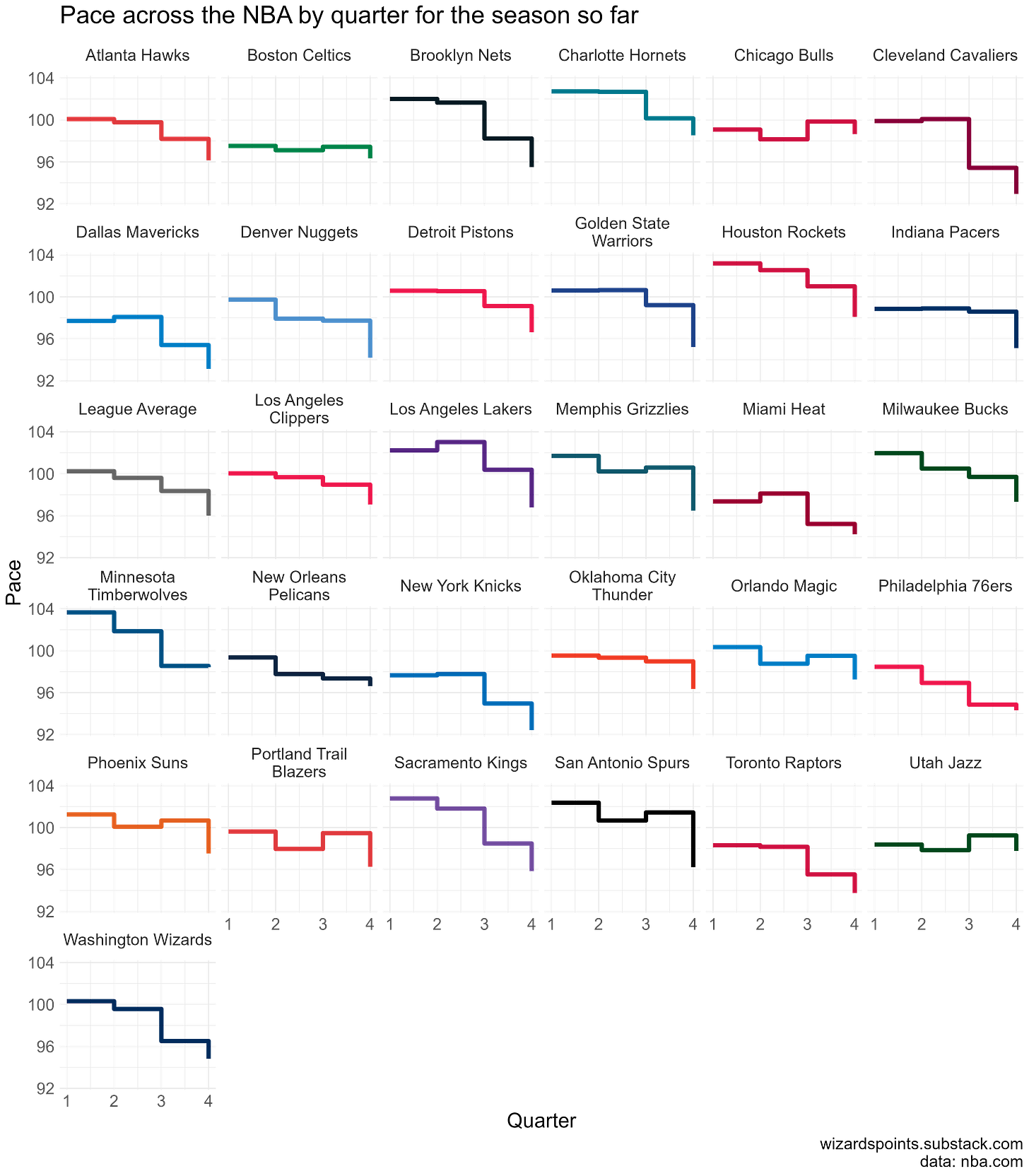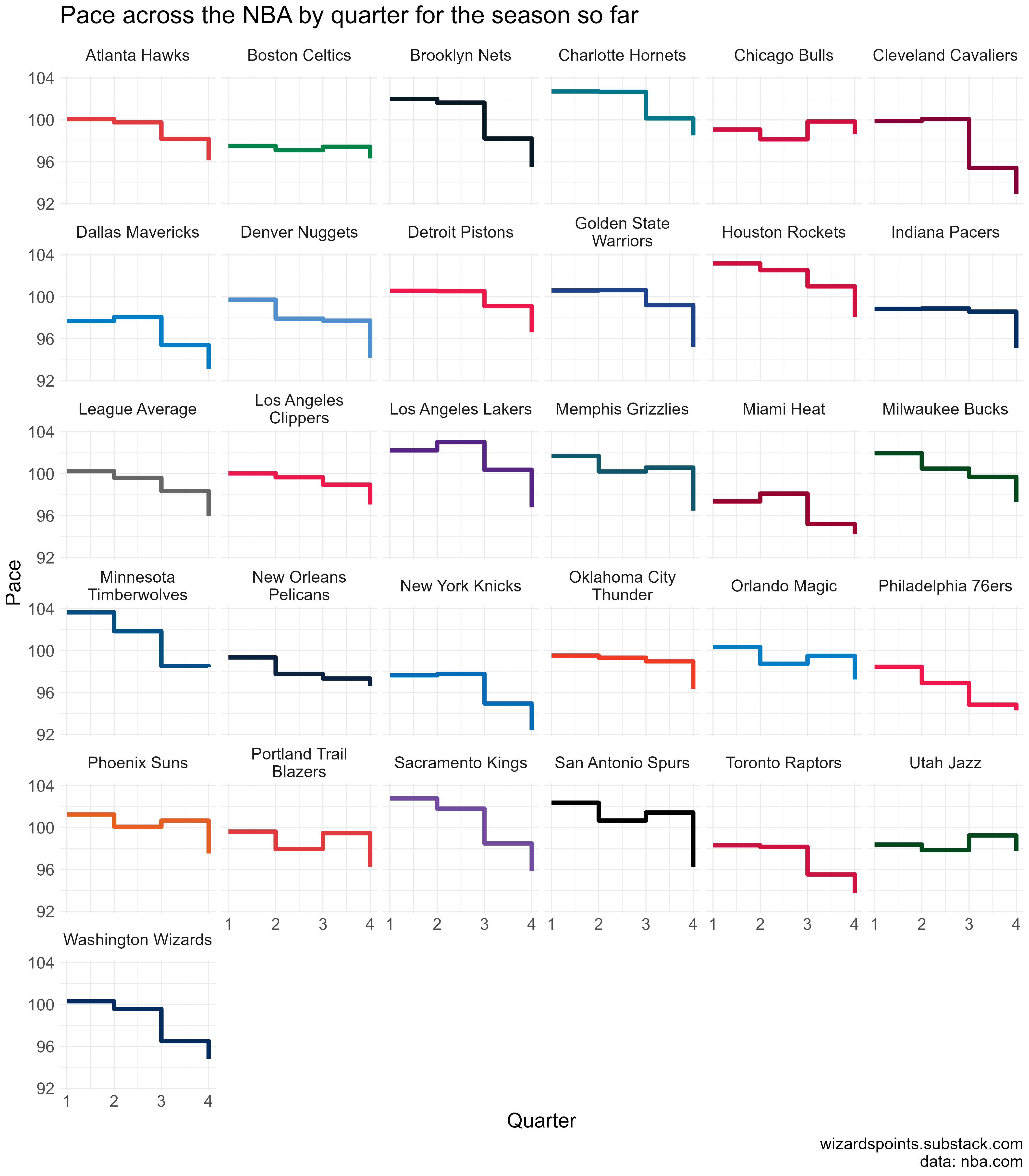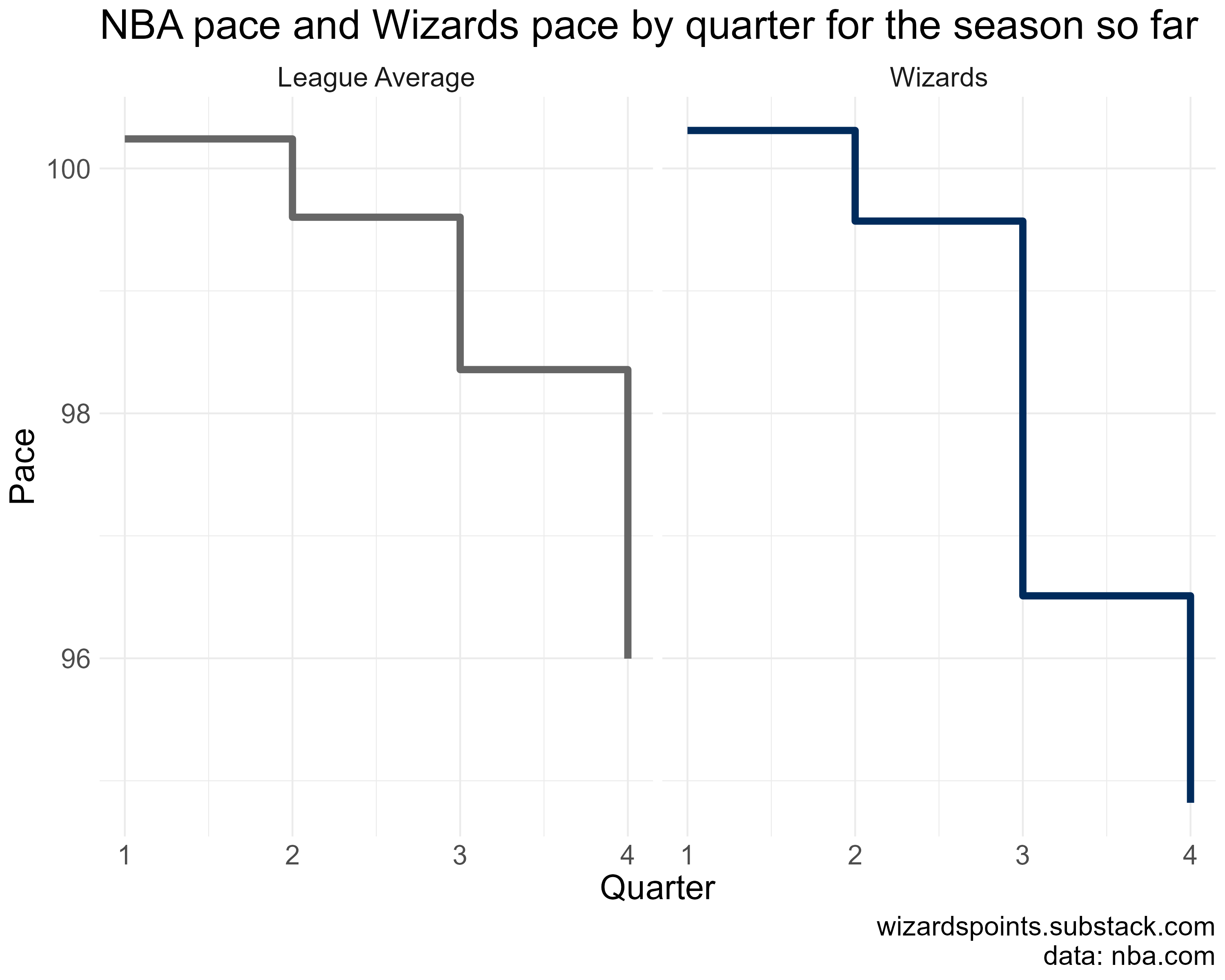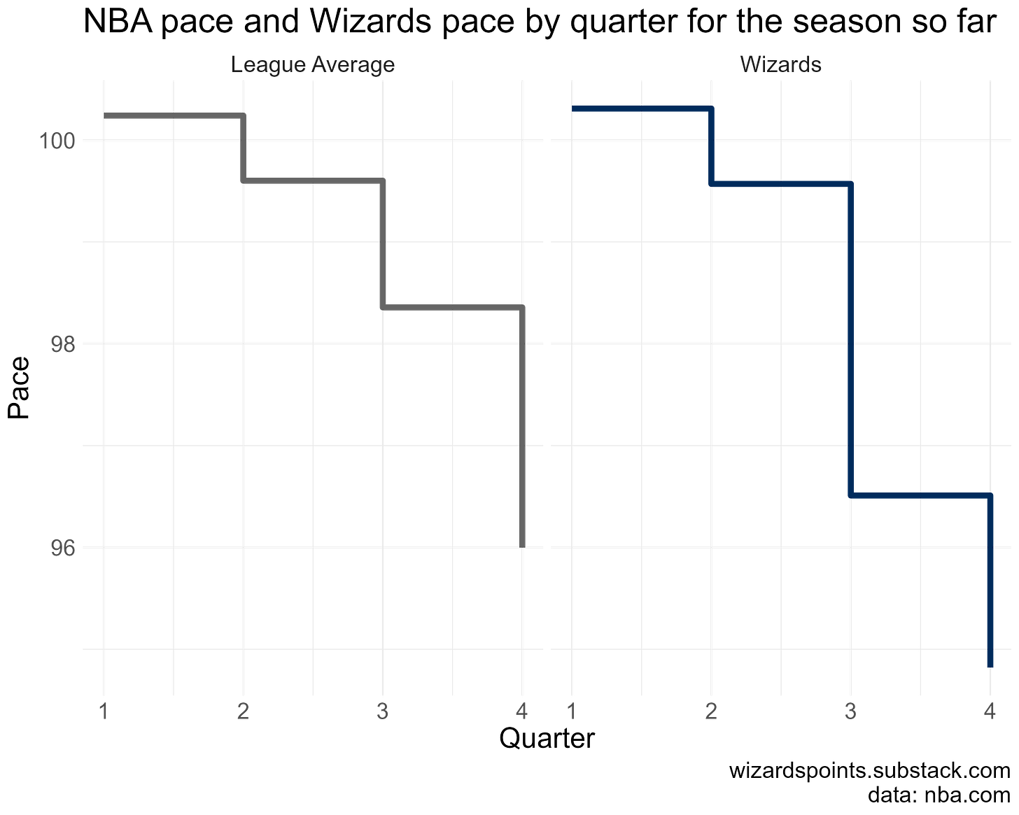Every season ebbs and flows. In looking at pace stats, I thought it would be interesting to break the figure above down further by looking at how the Wiz do on a quarter by quarter basis.