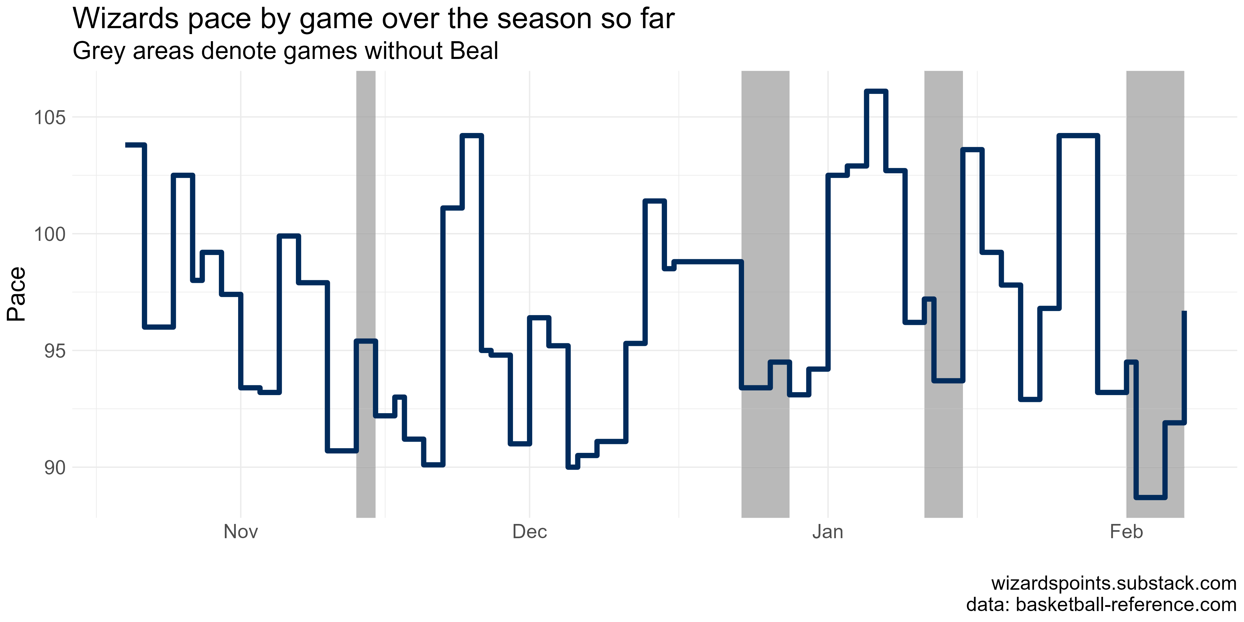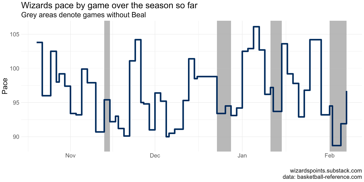 As the mid-season trade deadline comes to a close, it’s worth thinking about how losing Beal and gaining the high pace Ish Smith will change our fortunes. In this post, I wanted to at least provide a reference point for where we have been so far. Seeing what in-game pace looks like around the league provides some examples of how the team might shift its style to make the most of each possession. The trade season has been mild and wild, but now we know where we have been and where we have to go when it comes to pace.