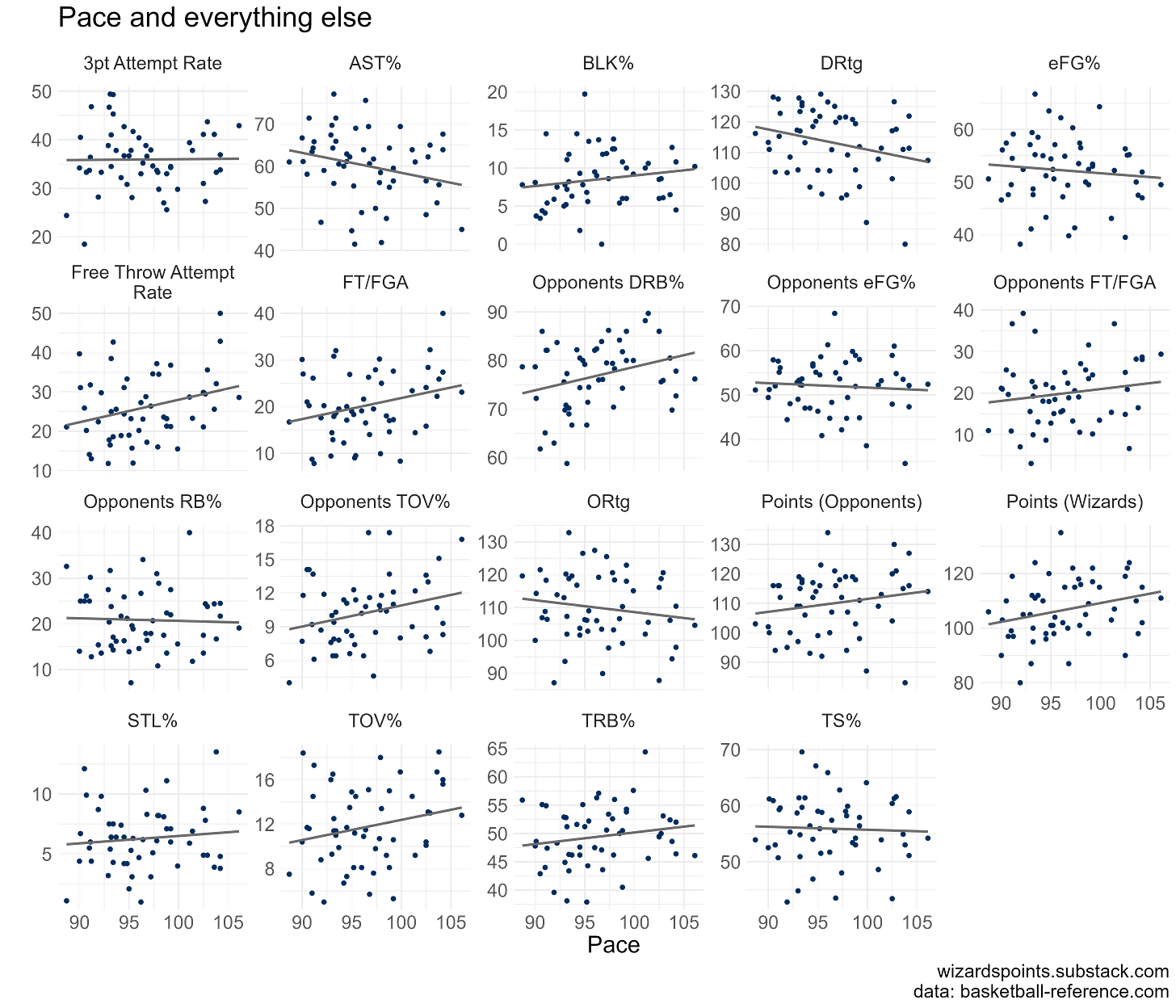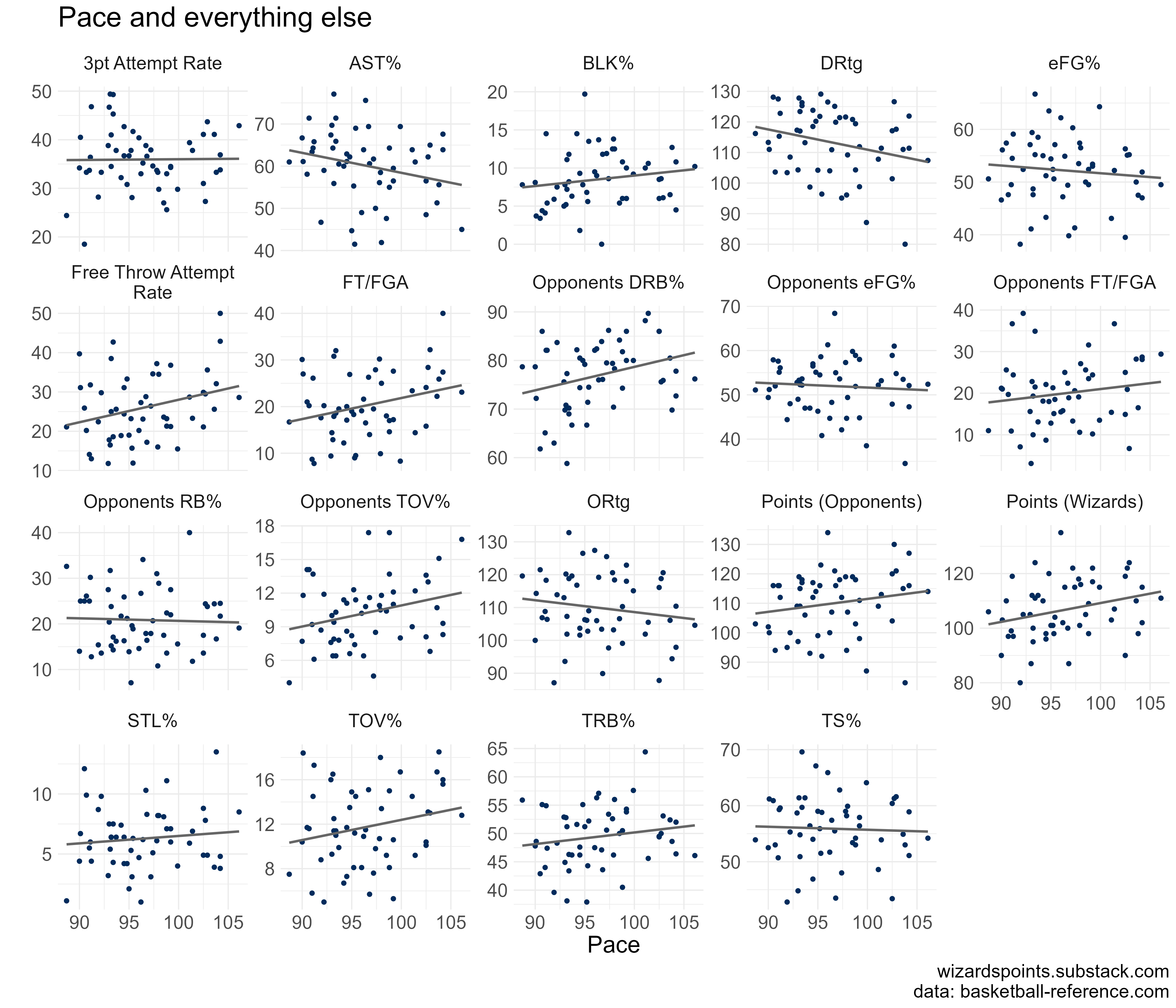 Still, we are a slower paced team. The average age of players with 10 or more games is 26. And this same group take about 8 attempts from the field per game on average. As the Wizards pace increases, so do turnovers (for both the Wizards and opponents) and a higher pace is slightly correlated with a lower defensive rating. The figure below throws a lot at you, but the key thing is if the line is going up, the measure increases as pace increases, if the grey line is going down, the measure goes down as pace increases. Flat lines, like the three point attempt rate, imply a weaker relationship.
