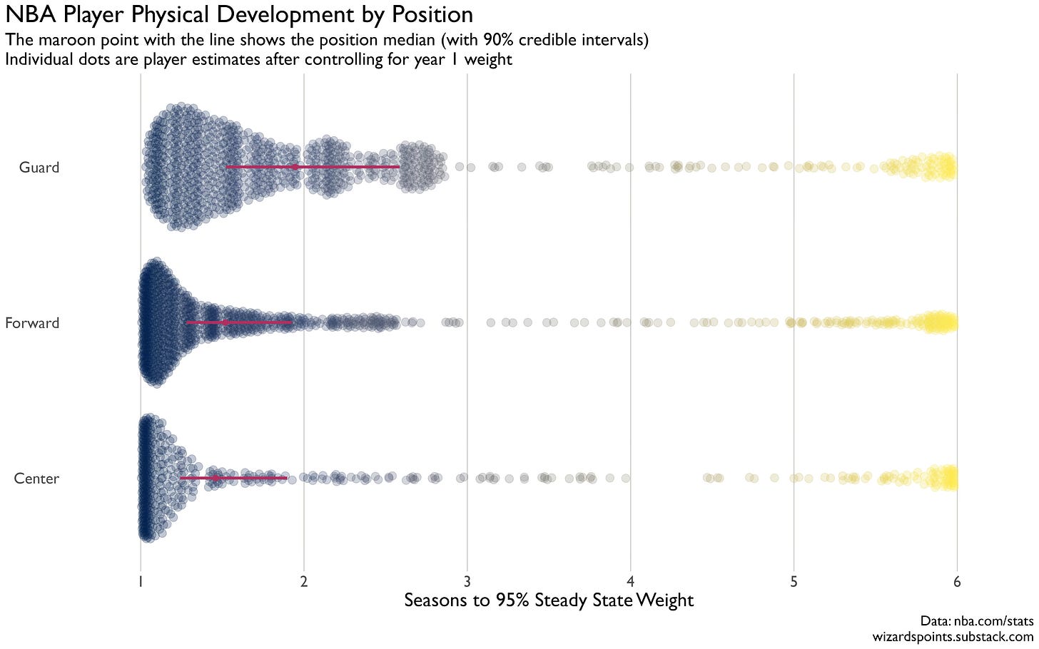 If you have ever had a small child, or known someone who has a small child, you have likely encountered a growth curve to understand whether or not a child is developing within some age appropriate range. Using the NBA’s weight data, I basically reconstructed this idea using each player’s first season weight and then tracking each subsequent season to understand the time it takes to get to 95 percent of their final or steady state weight, i.e., the point after which they kind of level off. Some players get there quickly (1-2 seasons), while others take longer (3-5 seasons).