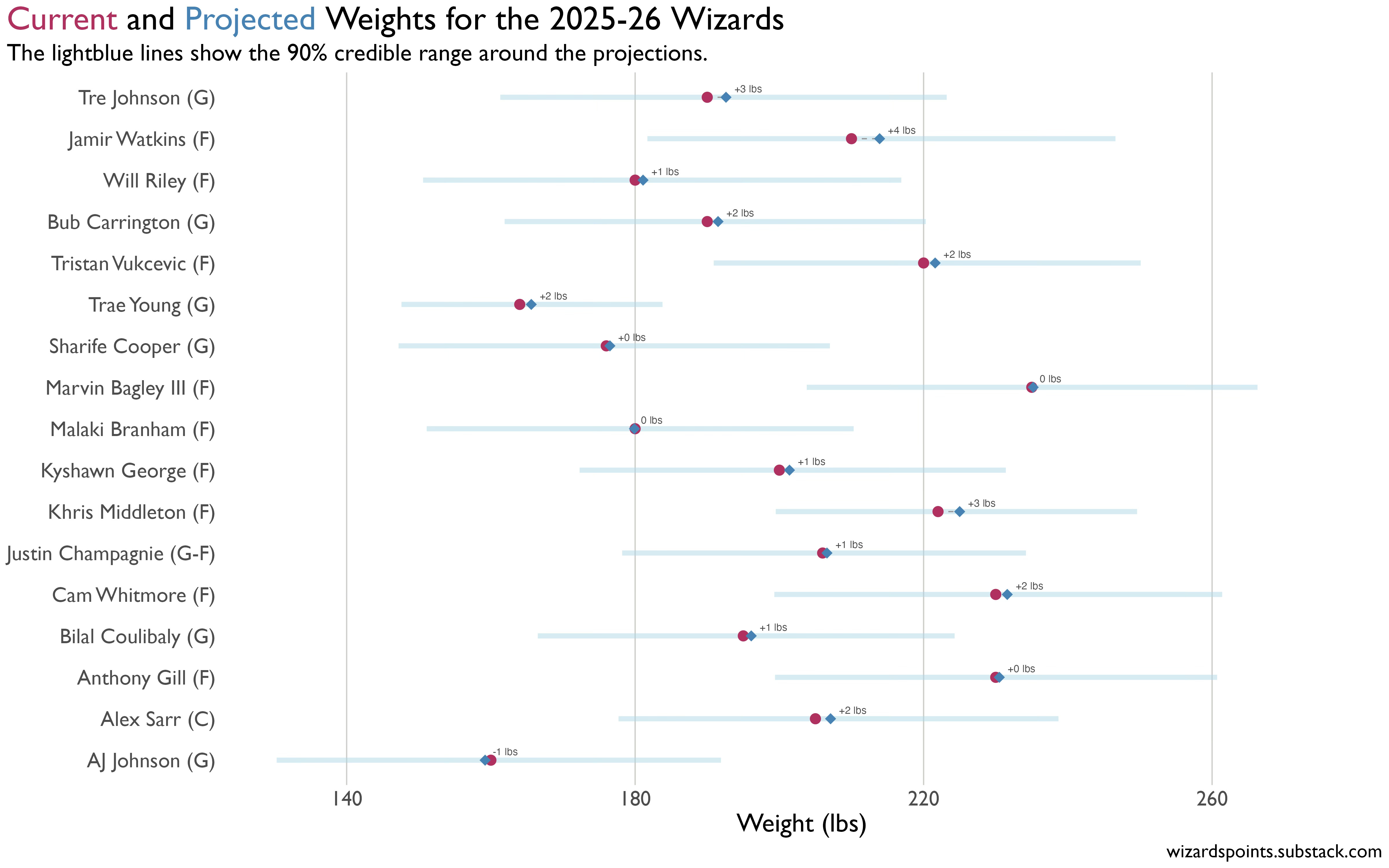 I plugged the current roster into the model to project where the guys might go and see who is likely still growing. Based on the number of seasons to get to each player’s projected steady state weight, Tre Johnson, Jamir Watkins, Will Riley, Alex Sarr, and Bub Carrington are projected to continue gaining weight in a way that the model suggests is outside of season-to-season variance. This is not too surprising given how young those players are. The model suggests that Tre Johnson is 1.6 seasons away from hitting 95% of his steady state weight, while Will Riley and Bub will be there next season. Notably, the model doesn’t quite know how to handle Sarr. It suggests that he is likely only about halfway through his development process, but also that he likely won’t gain that much more weight. This is sort of contradictory to me and not super helpful. Still, if most guys are who they are by season three, Sarr is nearly there. he’s leading the league in blocks per game. He’s developing an inside game. I don’t feel too worried that this model is kind of all over the place with him.
