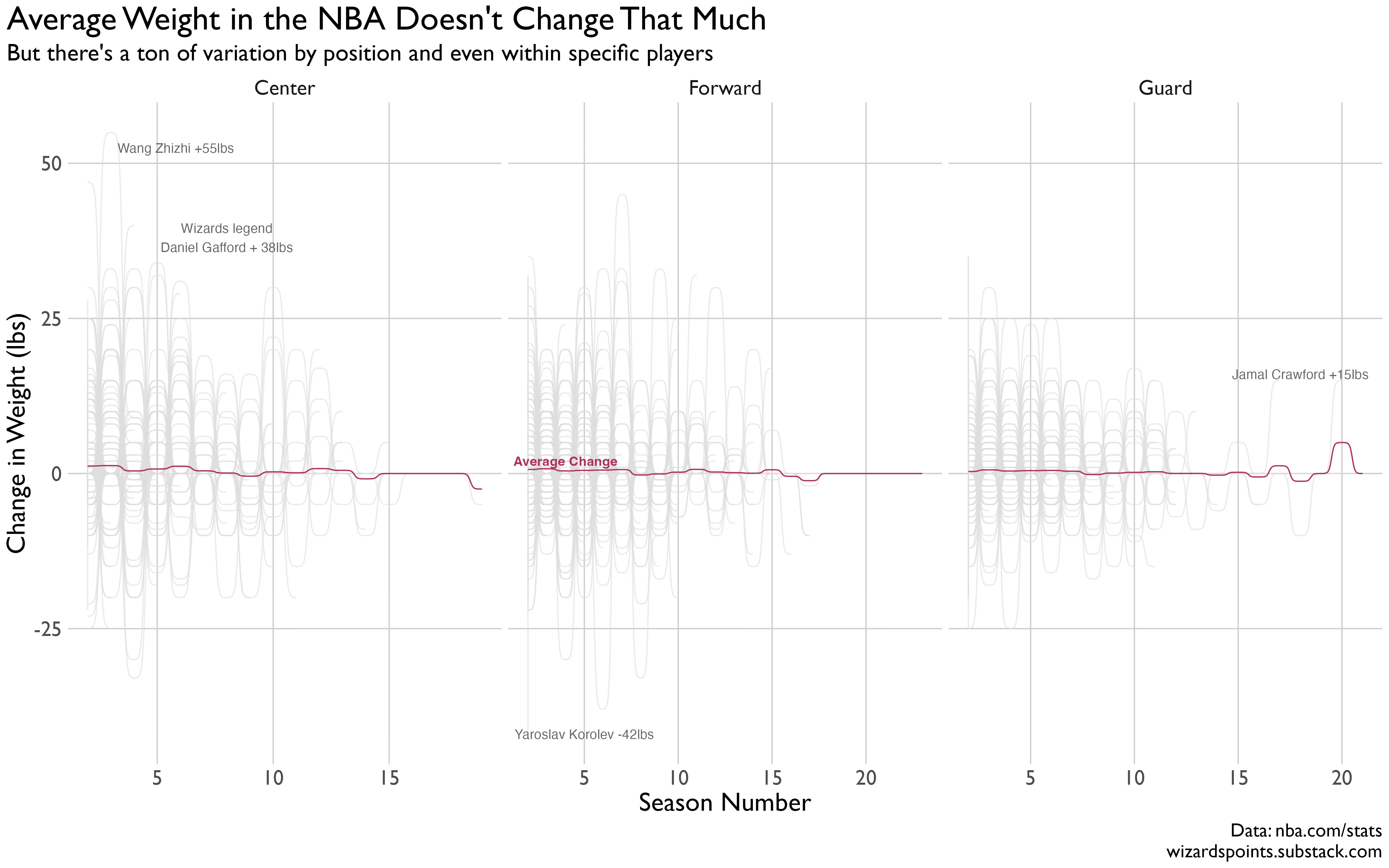 As we can see in the figure, the overall change in average weight doesn’t move that much season-to-season. Yet, some players see huge increases and decreases. Our old pal Daniel Gafford got traded to the Dallas Mavericks and suddenly had shoulders you could see from the upper deck. Similarly, Deni Avidja went from being listed at 210 pounds in his last season in DC to 240 when he started the 2024-25 season in Portland (weirdly, Deni is one of the few players who lost height, losing an inch between 24/25 and 25/26).